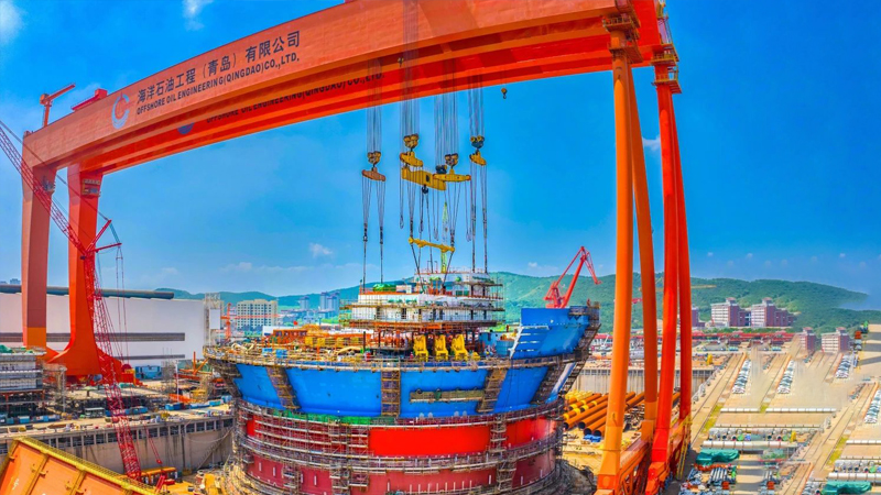 2023年12月,由我國自主設(shè)計(jì)建造的亞洲首艘圓筒型“海上油氣加工廠”“海洋石油122”浮式生產(chǎn)儲卸油裝置——“海葵一號”超級能源碗在青島完成主體建造,巨力索具提供800噸吊梁、400噸、500噸吊排及配套索具組成成套吊裝系統(tǒng),全程配合吊裝順利進(jìn)行。