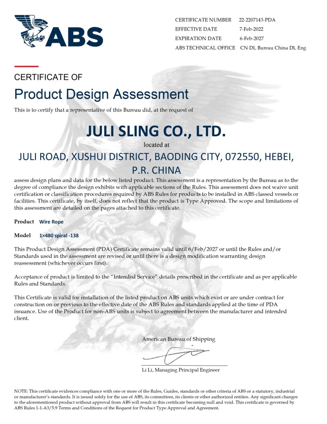 (系泊鋼絲繩ABS認可證書)