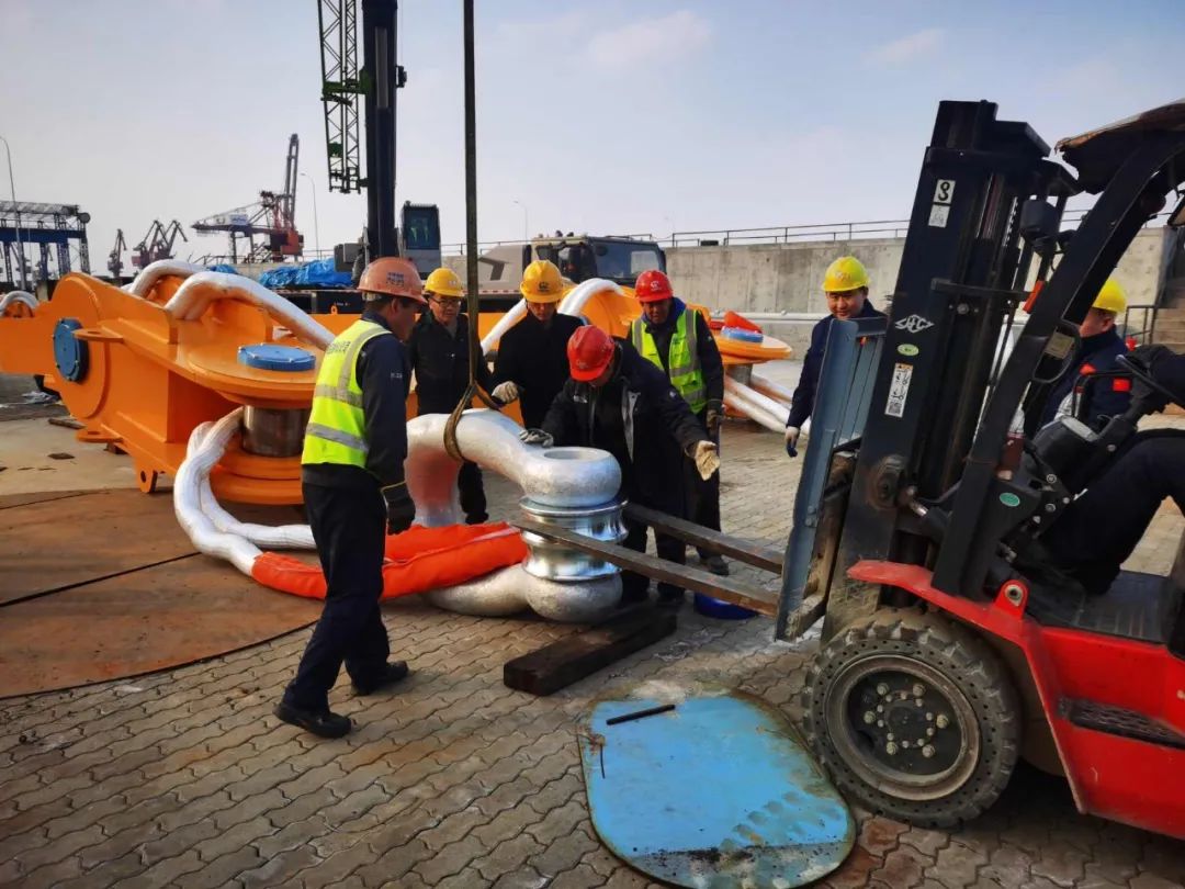 【巨力工程】青龍門特大橋首件永久防撞鋼套箱吊裝上船