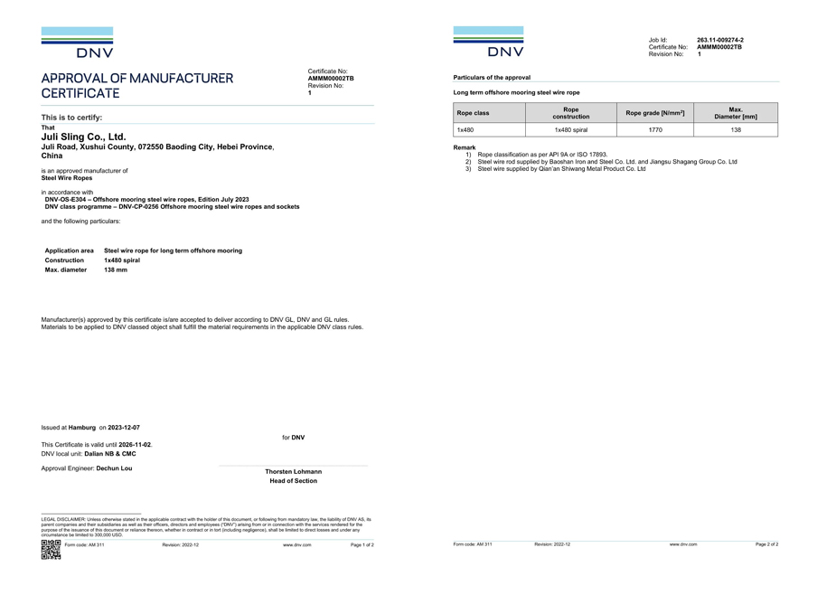 2020年11月,巨力索具取得了永久系泊用單股涂塑鋼絲繩的DNV·GL工廠認(rèn)可證書(shū),成為國(guó)內(nèi)首家通過(guò)該類鋼絲繩DNV·GL工廠認(rèn)可的廠家。