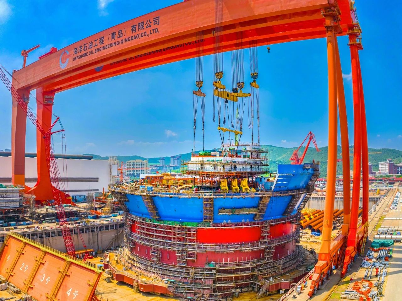 2023年12月,由我國自主設計建造的亞洲首艘圓筒型“海上油氣加工廠”“海洋石油122”浮式生產儲卸油裝置——“海葵一號”超級能源碗在青島完成主體建造,巨力索具提供800噸吊梁、400噸、500噸吊排及配套索具組成成套吊裝系統,全程配合吊裝順利進行。