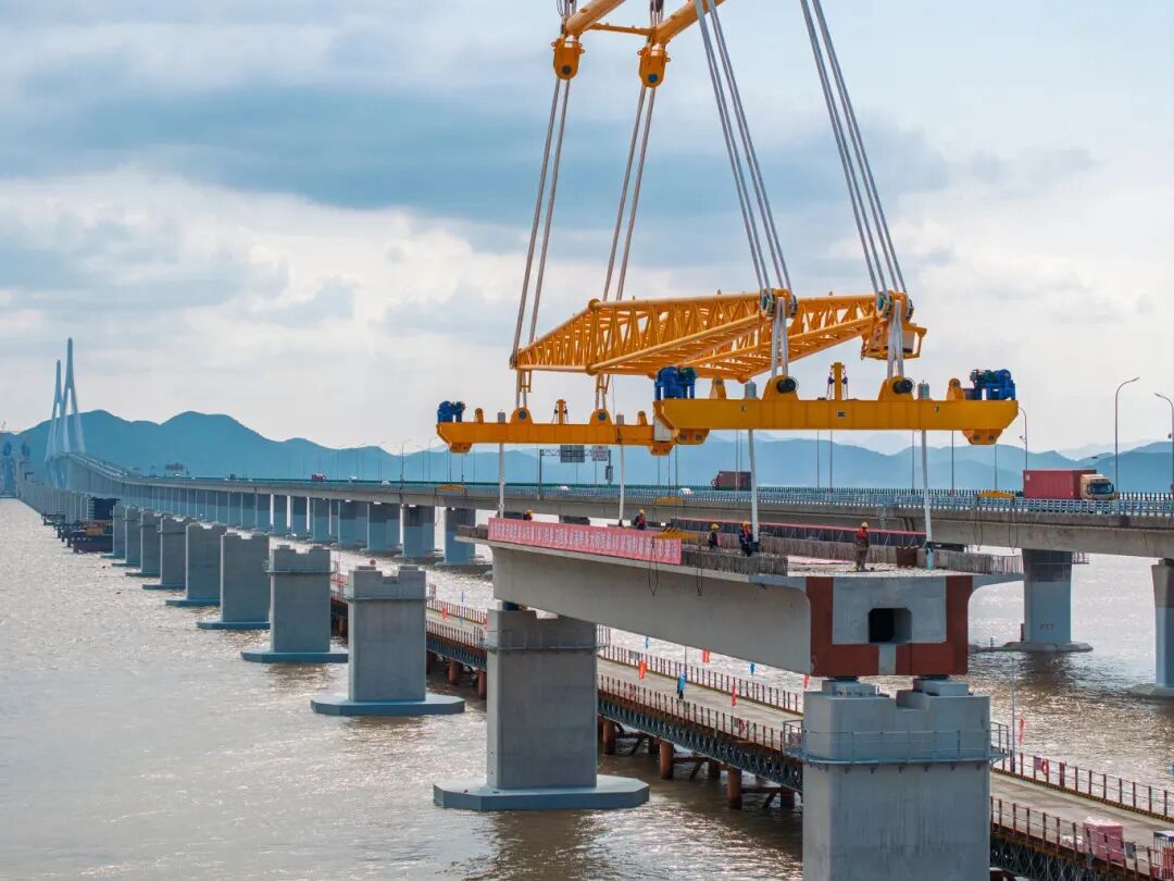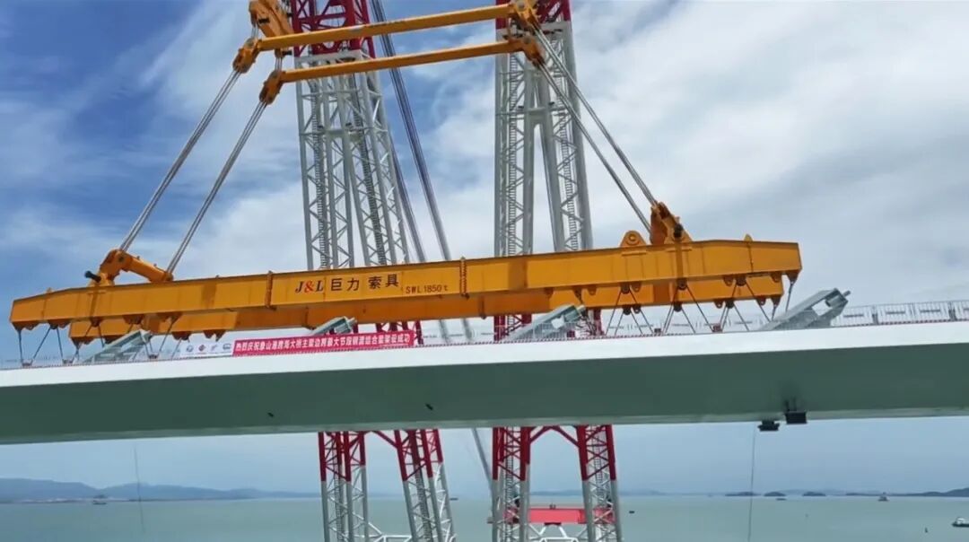 早在2024年11月,巨力索具便以定制化吊具助力該橋重達1700噸的首榀預制箱梁精準落位。該箱梁長60米、寬10.6米,是國內市域鐵路工程中跨度最大、噸位最重的預應力混凝土預制箱梁,橋面至海面距離最大約52米,接近20層樓高度,且毗鄰既有象山港公路大橋,操作空間狹小,對吊具穩(wěn)定性、吊裝精度和施工安全性要求極高。