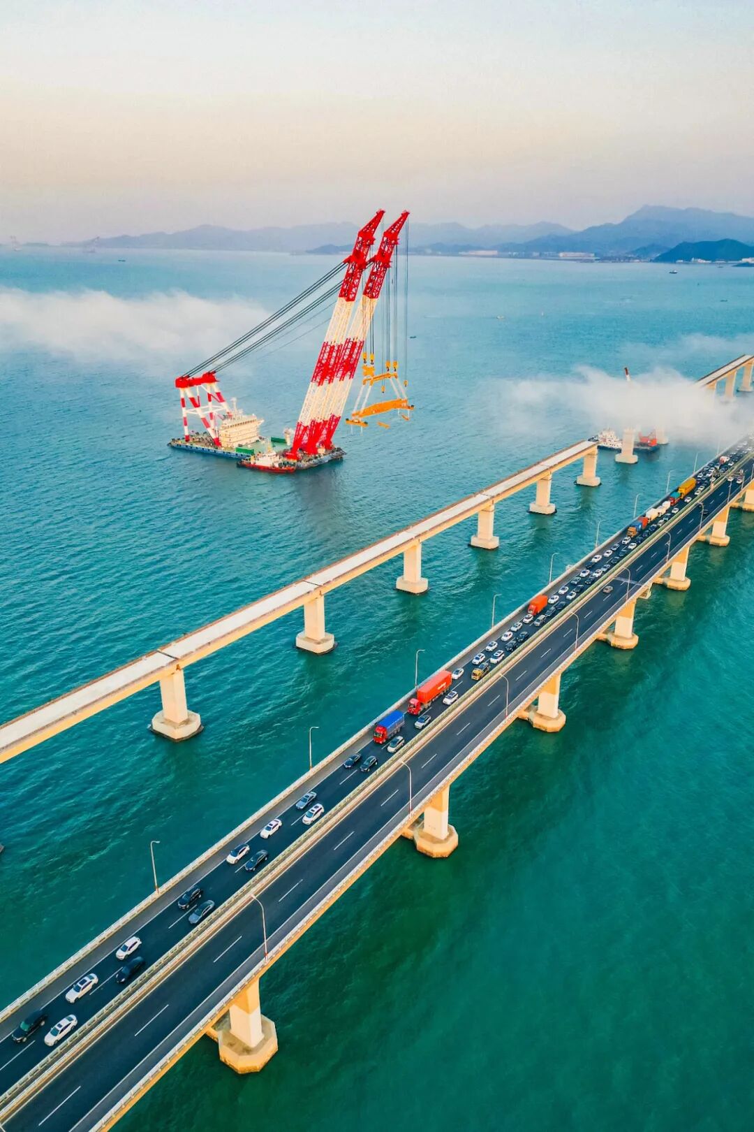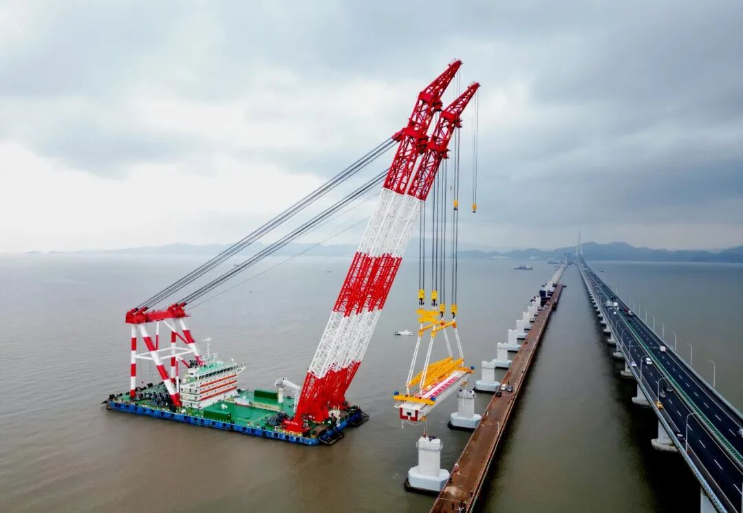 此次架設的鋼梁長107.5米,重約1779噸,加吊具總重2182噸,相當于1500輛家用轎車的重量,橋面至海面最大高度達53米(近20層樓高),鋼梁架設區(qū)域毗鄰既有象山港公路大橋,船舶站位緊鄰主航道,往來船只流量大,施工空間狹小、船舶通航密集,對吊裝精度與穩(wěn)定性提出嚴苛要求。