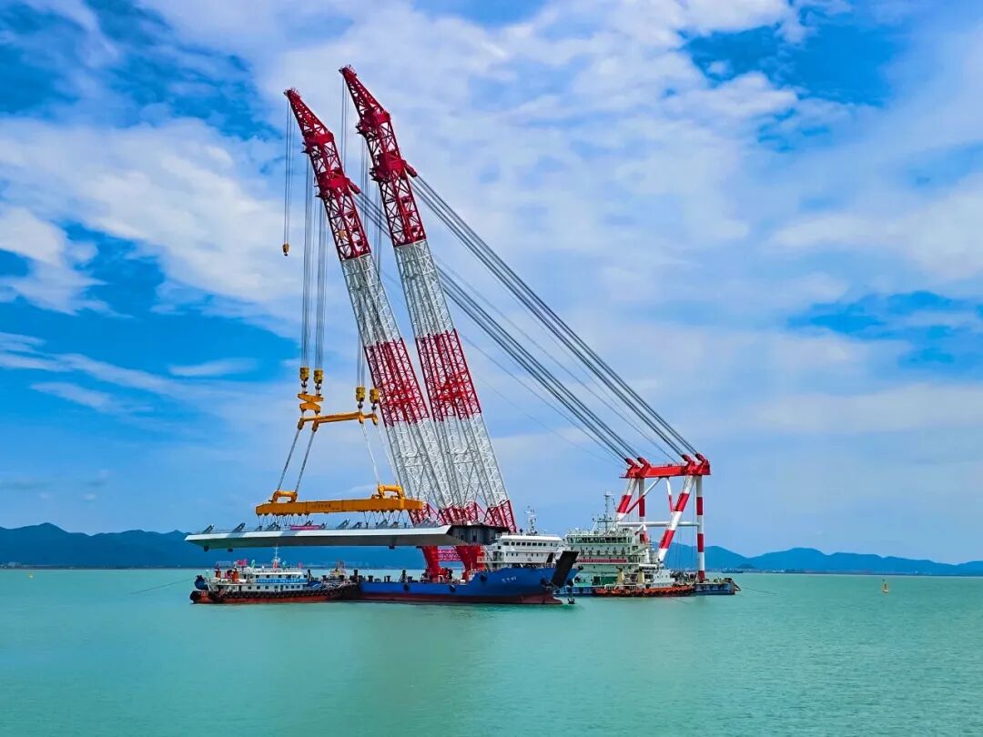巨力索具針對復雜海況與空間限制,提供先進吊裝設備,研發(fā)定制化吊裝方案,與客戶單位通過三維建模模擬“鐵建大橋起1”號起重船吊裝路徑,動態(tài)調整船舶錨泊系統(tǒng),將誤差控制在厘米級,配備吊運平衡系統(tǒng)與3D可視化動態(tài)監(jiān)測系統(tǒng),實時監(jiān)控吊裝過程,同時制定了多套應急預案,確保鋼梁在強風、涌浪中穩(wěn)定吊裝。這一系列技術突破,使“海上穿針”成為現(xiàn)實,為大橋主體結構施工奠定堅實基礎。