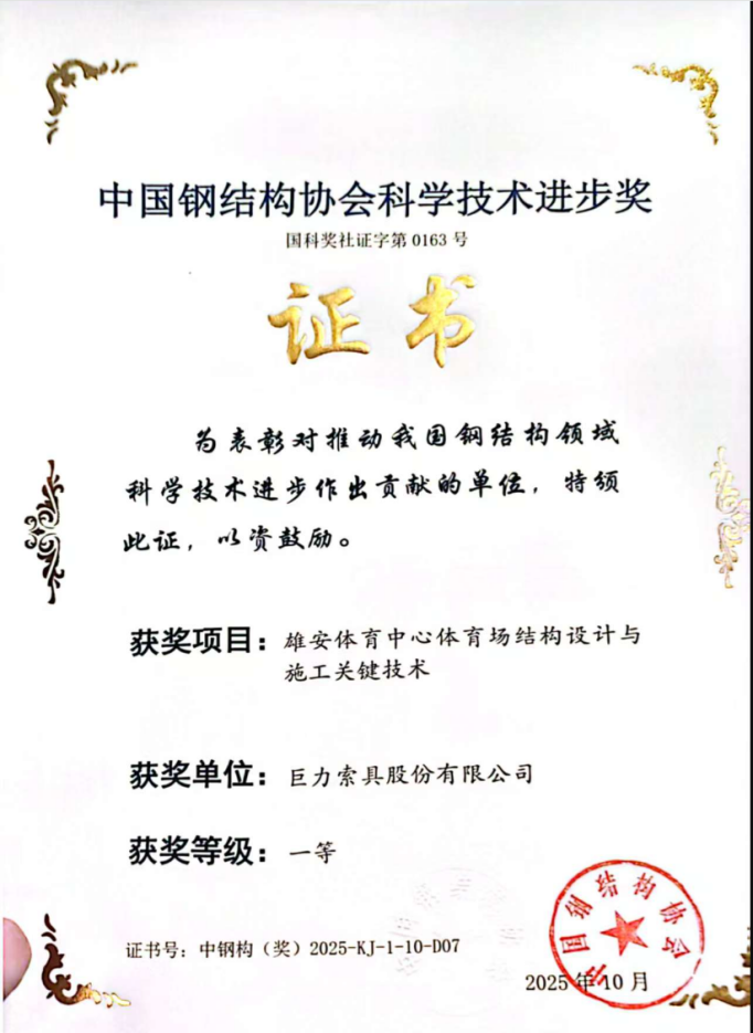 “一次榮獲三項一等獎,是對巨力索具研發(fā)團隊創(chuàng)新能力的高度肯定,更是我們多年來堅持‘技術(shù)驅(qū)動未來’理念的集中體現(xiàn)。”公司技術(shù)負(fù)責(zé)人表示,“這些成果的落地,離不開行業(yè)專家的指導(dǎo),更離不開業(yè)主、設(shè)計院、監(jiān)理、總包等各方伙伴的信任與支持。”未來,巨力索具將繼續(xù)深耕索具核心技術(shù)研發(fā),聚焦綠色建筑、智能建造、新材料應(yīng)用等方向,持續(xù)推動行業(yè)技術(shù)進(jìn)步,致力于成為全球索具系統(tǒng)解決方案的引領(lǐng)者。