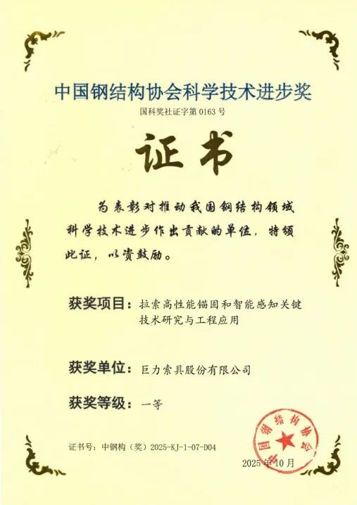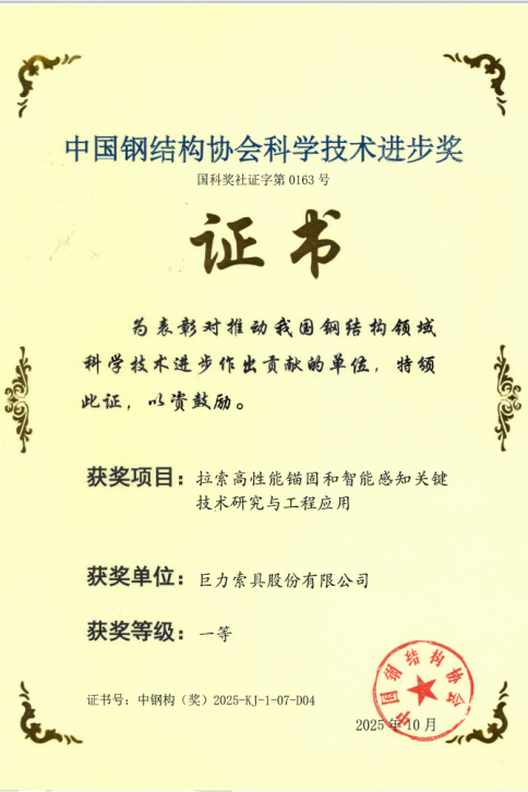 近日,2025年度中國鋼結(jié)構(gòu)協(xié)會科學(xué)技術(shù)進(jìn)步獎評審結(jié)果揭曉。在10月14日于廣西南寧舉行的頒獎典禮上,巨力索具股份有限公司憑借卓越的技術(shù)研發(fā)實力,一舉斬獲三項一等獎,充分彰顯了公司在高端索具技術(shù)領(lǐng)域的創(chuàng)新引領(lǐng)地位。