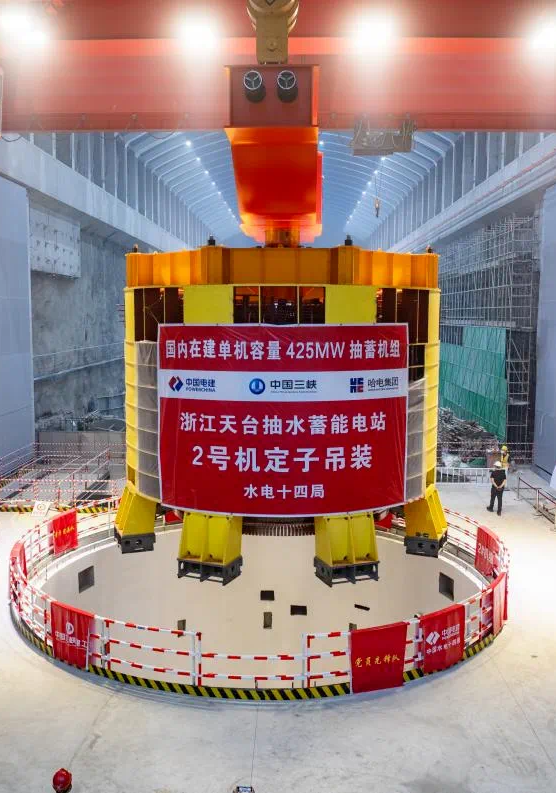 世界最高水頭抽蓄電站——浙江天臺抽水蓄能電站2號機(jī)組定子就位工作,巨力索具為其定制了配置八組起吊桿的定子吊具,確保其能夠承受巨大拉力和沖擊力。