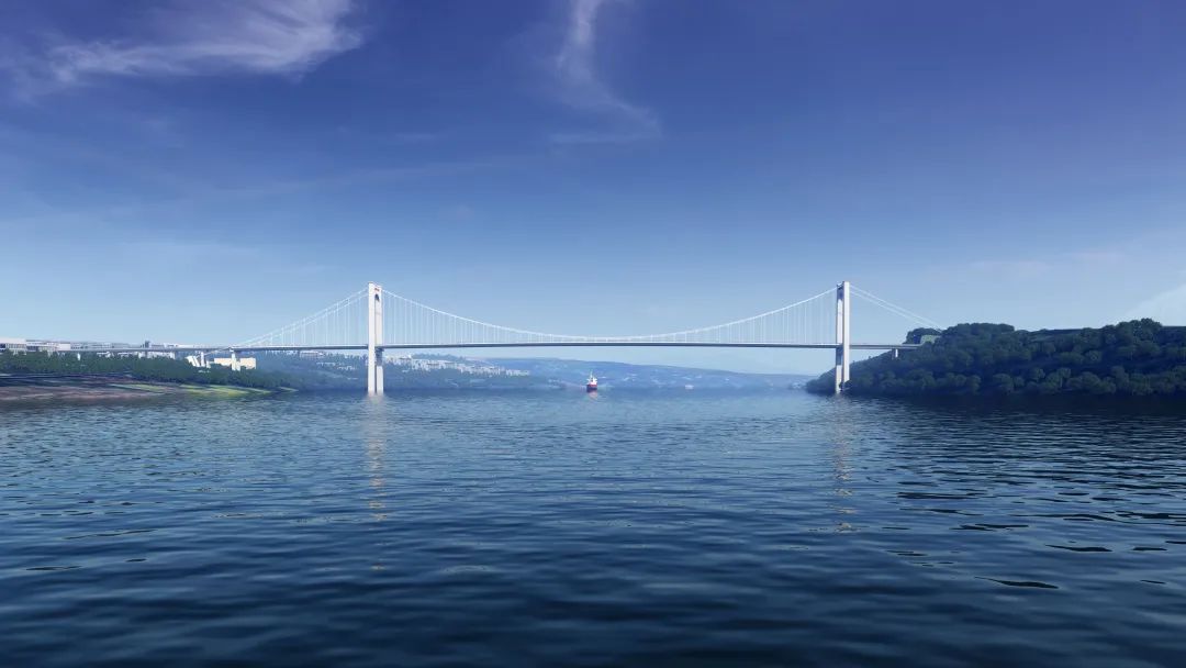 主橋為主跨590米雙塔雙索面鋼箱梁懸索橋