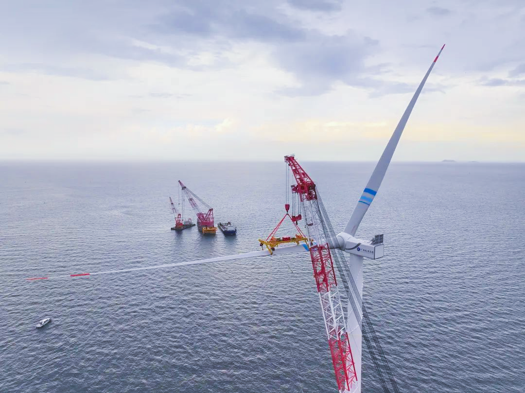 據悉,本次吊裝的風電機組單支葉片長111.5米、重42噸,葉輪掃風面積40627平方米。