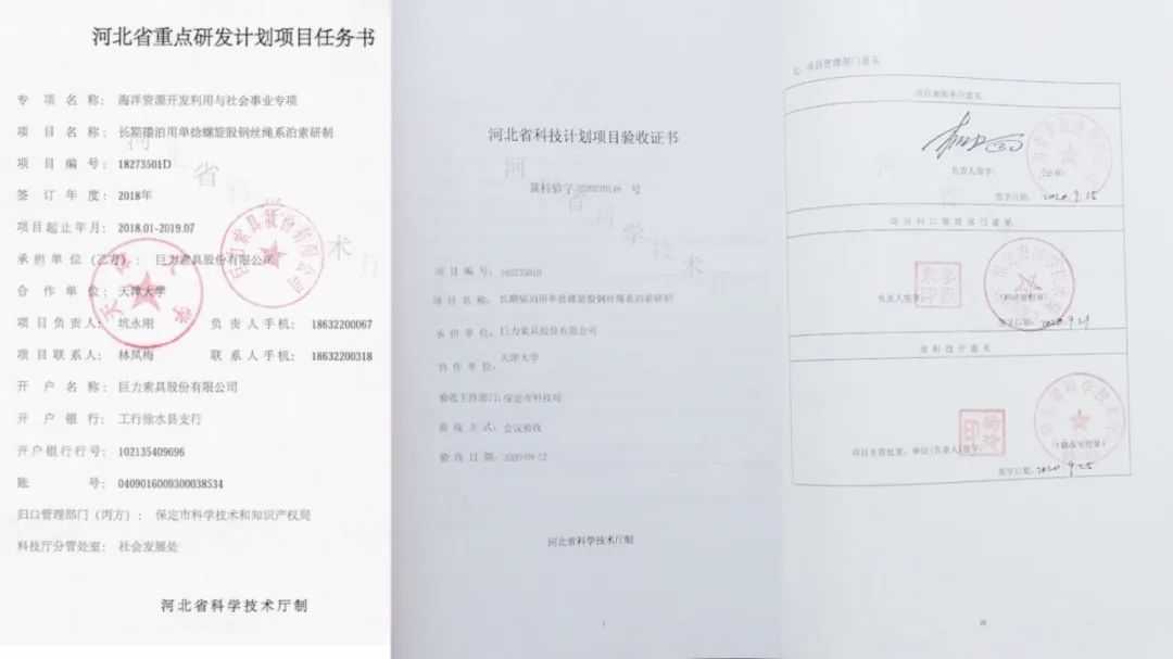2020年9月12日,巨力索具“長(zhǎng)期錨泊用單捻螺旋股鋼絲繩繩系泊索研制”通過了河北省科技廳組織的驗(yàn)收,項(xiàng)目完成了長(zhǎng)期錨泊系泊索索體、閉式澆鑄接頭、彎曲限制器的產(chǎn)品研發(fā),形成了系泊索集成設(shè)計(jì),集成配套的能力。